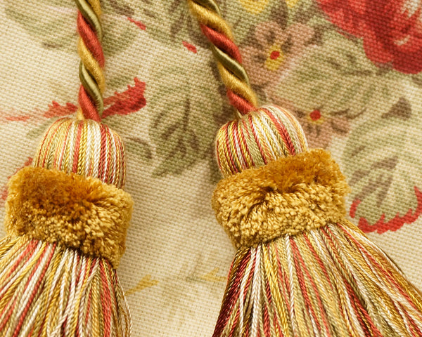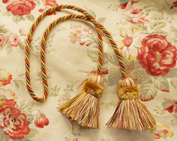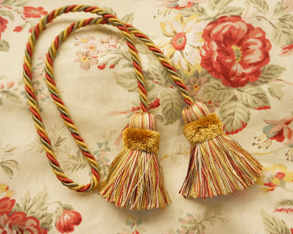 キャメルカラーに、落ち着いた赤身と緑系の色が加わった落ち着いた華やかな雰囲気のチェアタイタッセルです。